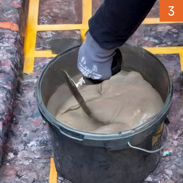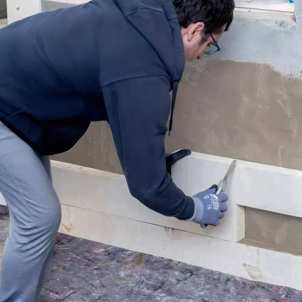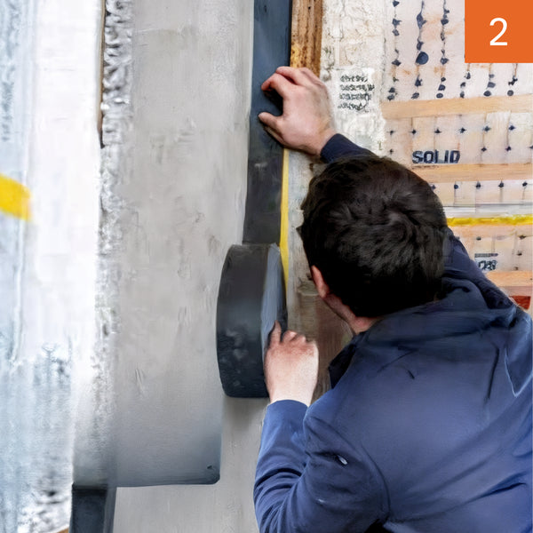Auf das waagerecht verlegte Trennband wird eine erste Schicht des kapillaraktiven Universalmörtels iQ M in einer Dicke von ca. 1 mm aufgetragen. Anschließend wird die Mischung senkrecht auf die Wandfläche aufgetragen.