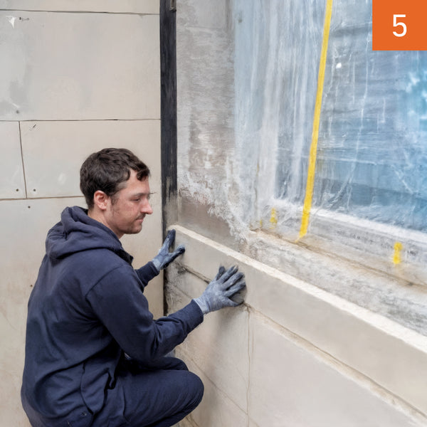 Die erste Reihe der iQ-Therm 2.0 Dämmplatten wird im Klebemörtel verlegt. Die Stöße zwischen den Platten werden nicht verklebt.